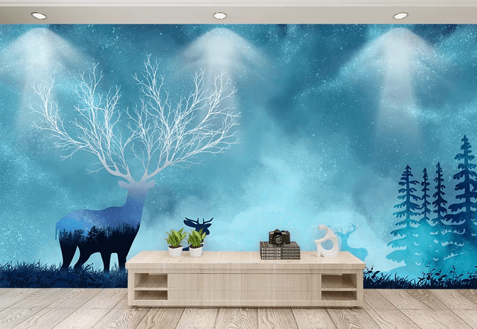 3D Blue Trees Elk Wall Mural Wallpaper 407