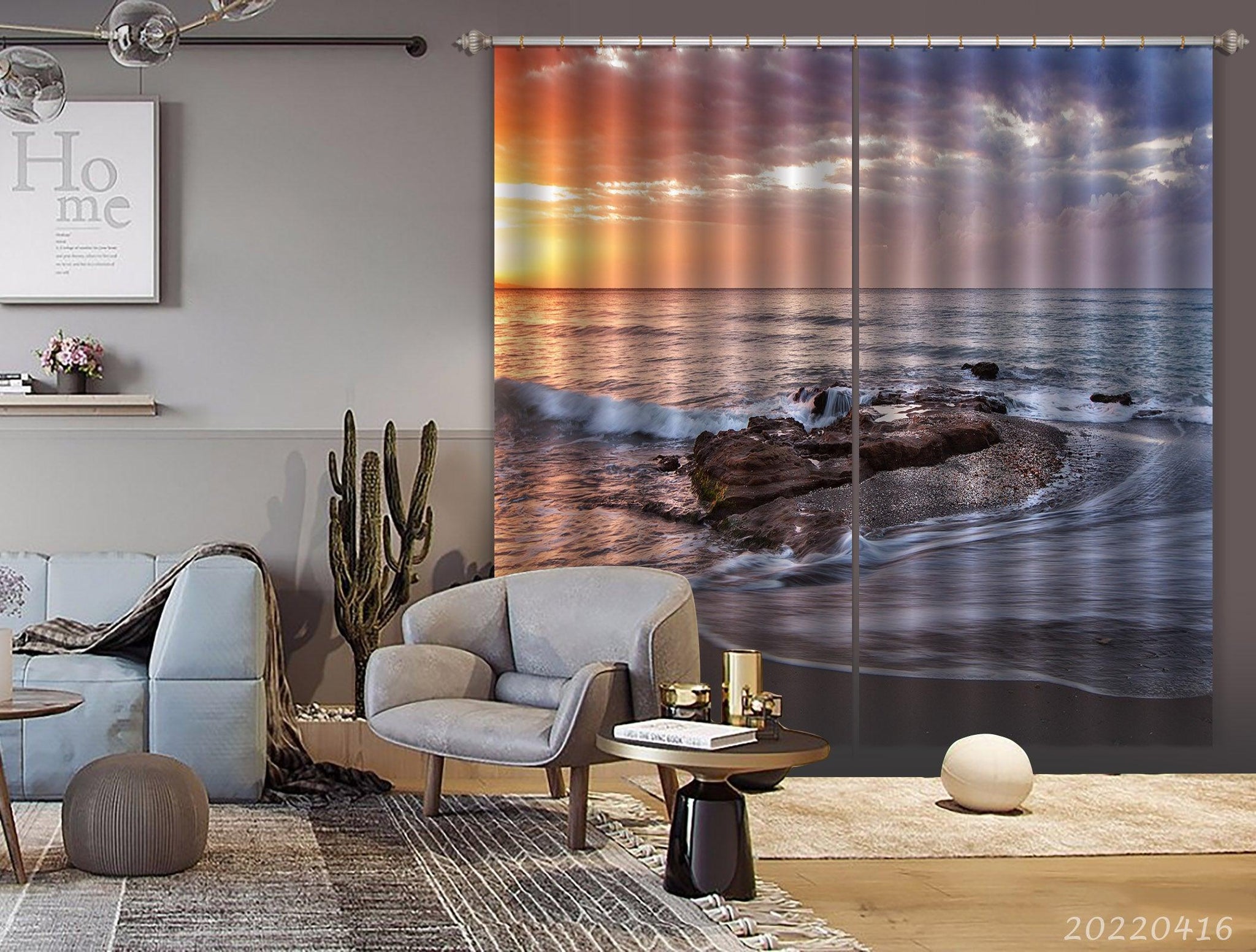 3D Landscape Ocean Reef Wave Golden Skyline Cloudy Curtains and Drapes GD 4390
