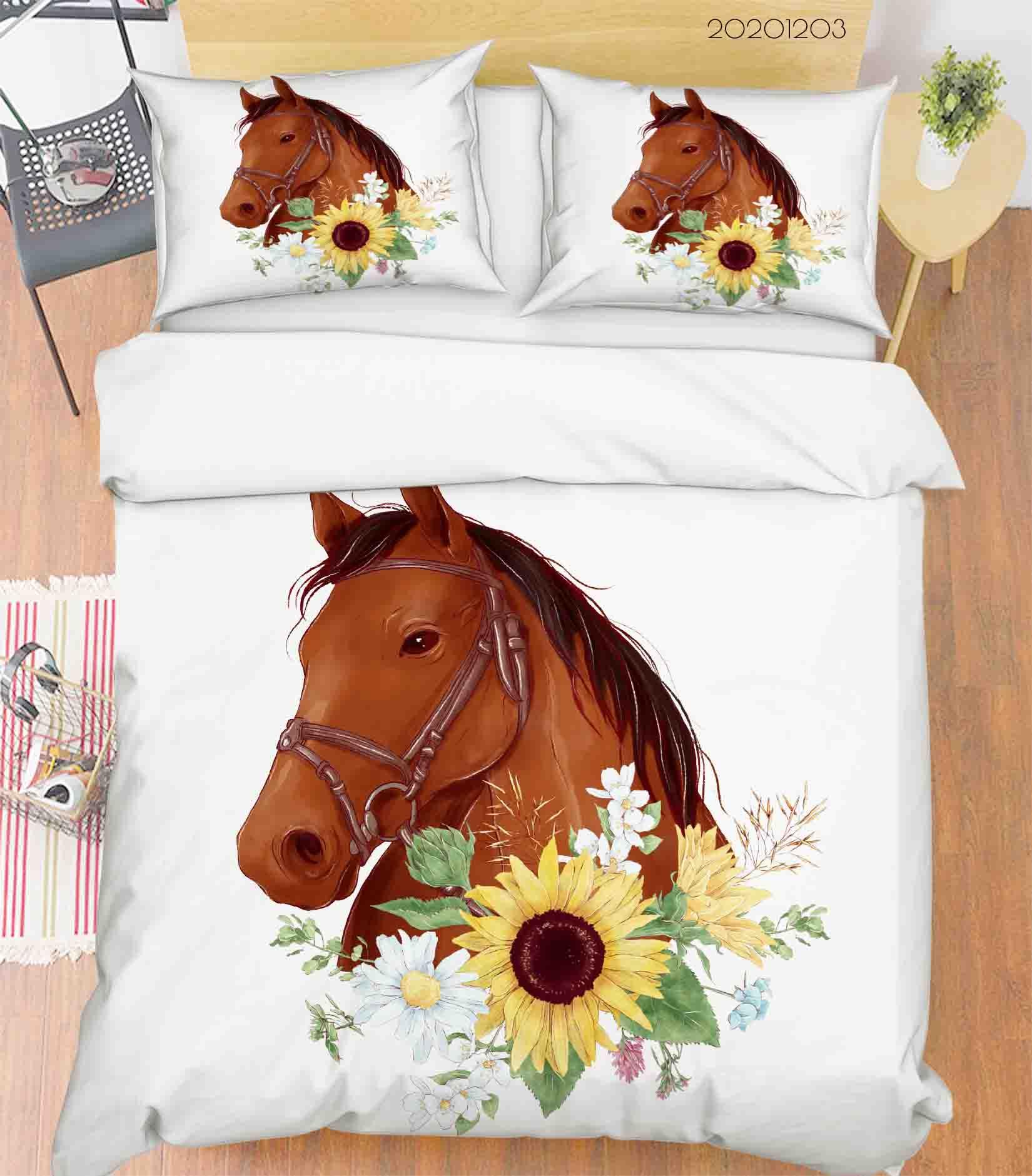 3D Hand Drawn Fine Art Brown Horse Animal Sun Flower Yellow Floral Quilt Cover Set Bedding Set Duvet Cover Pillowcases LXL