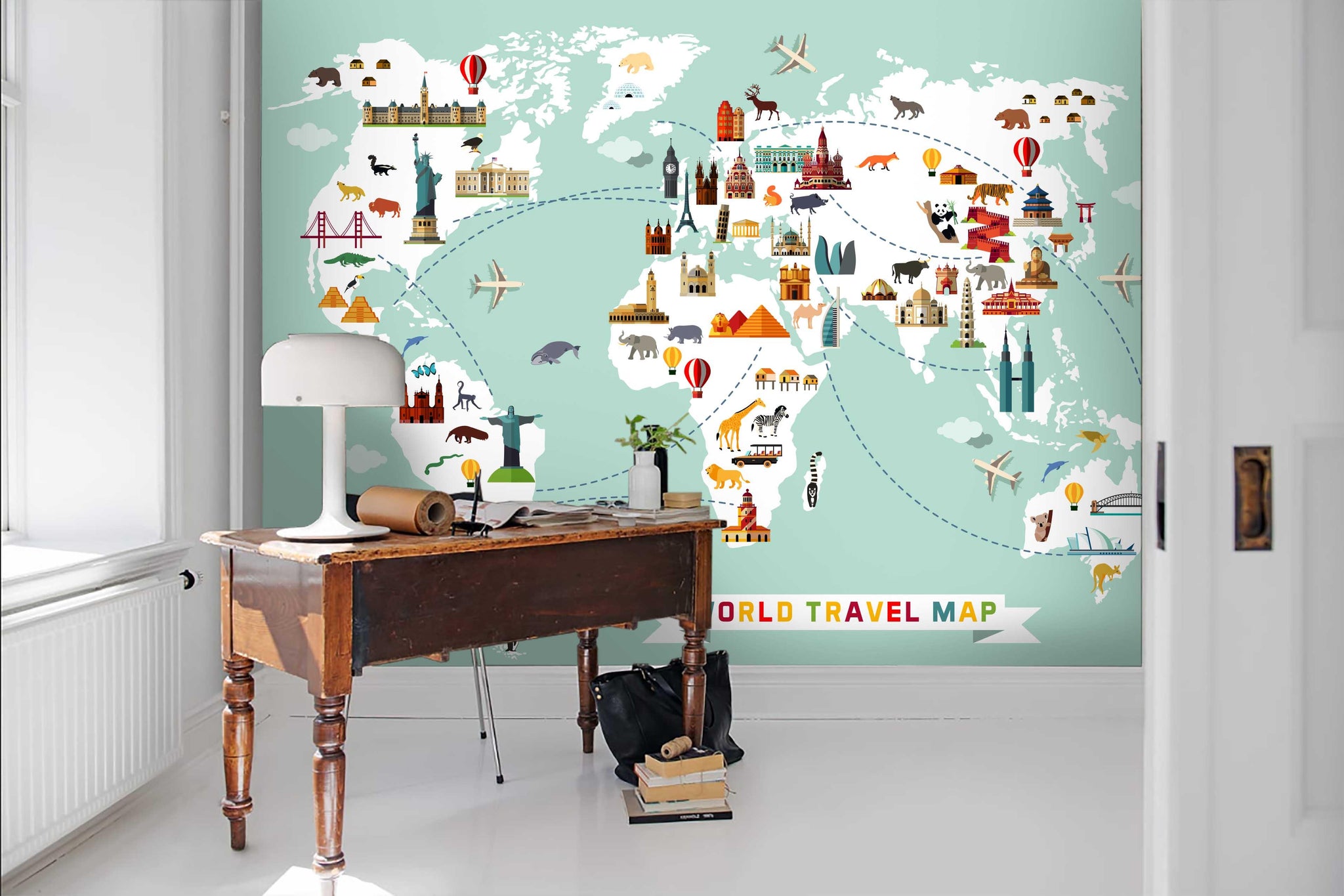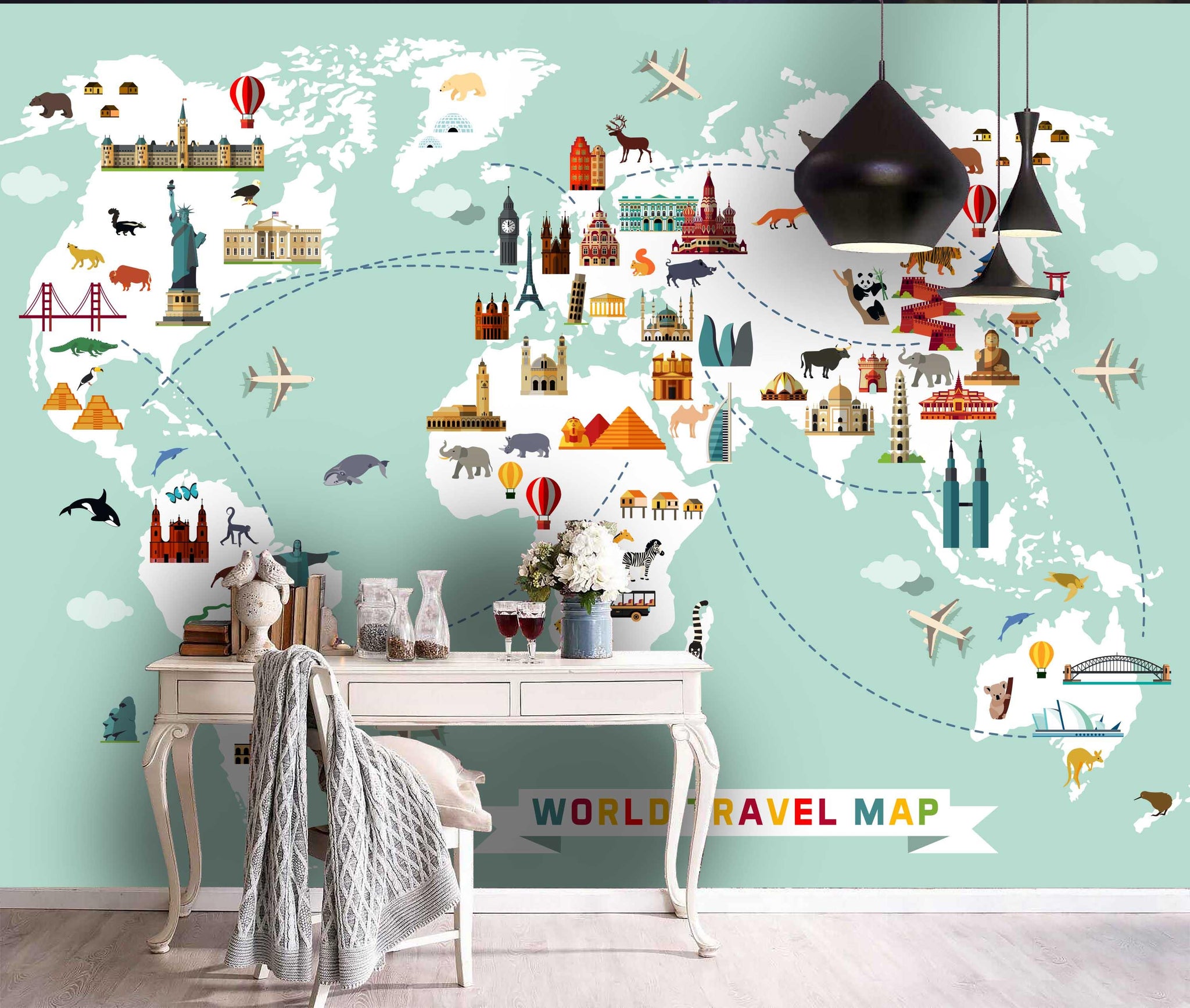 3D Hand Drawn World Map Cartoon Animals Historic Sites Vehicles Wall Mural Wallpaper GD 1799