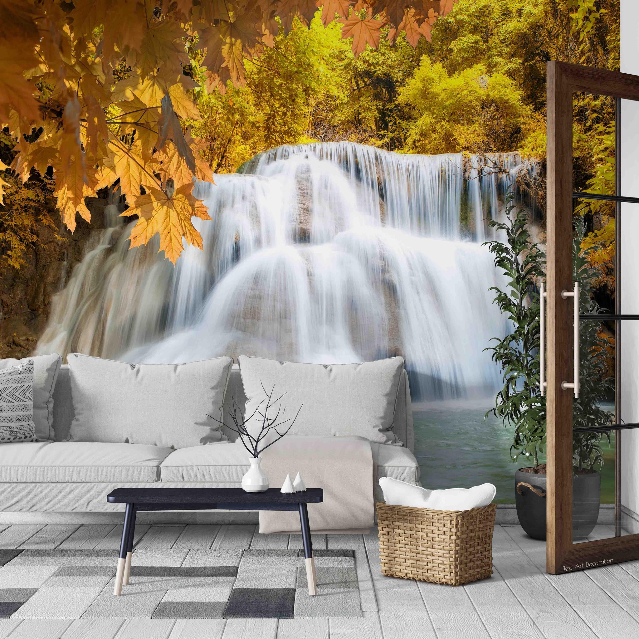 3D Waterfall Plant Maple Leaf Golden Landscape Wall Mural Wallpaper LLL 1792