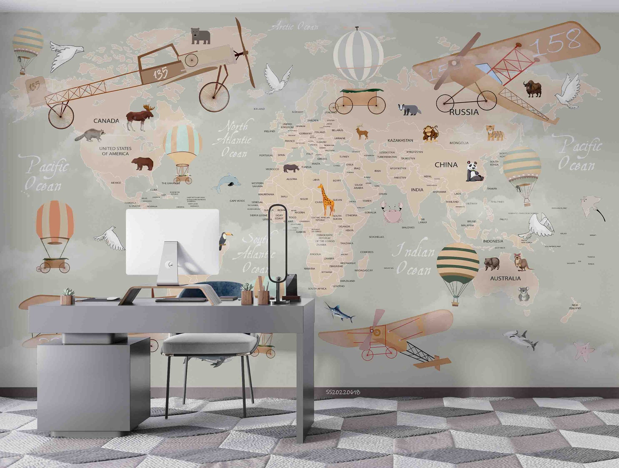 3D World Map Cartoon Animal Aircraft Balloon Wall Mural Wallpaper GD 863