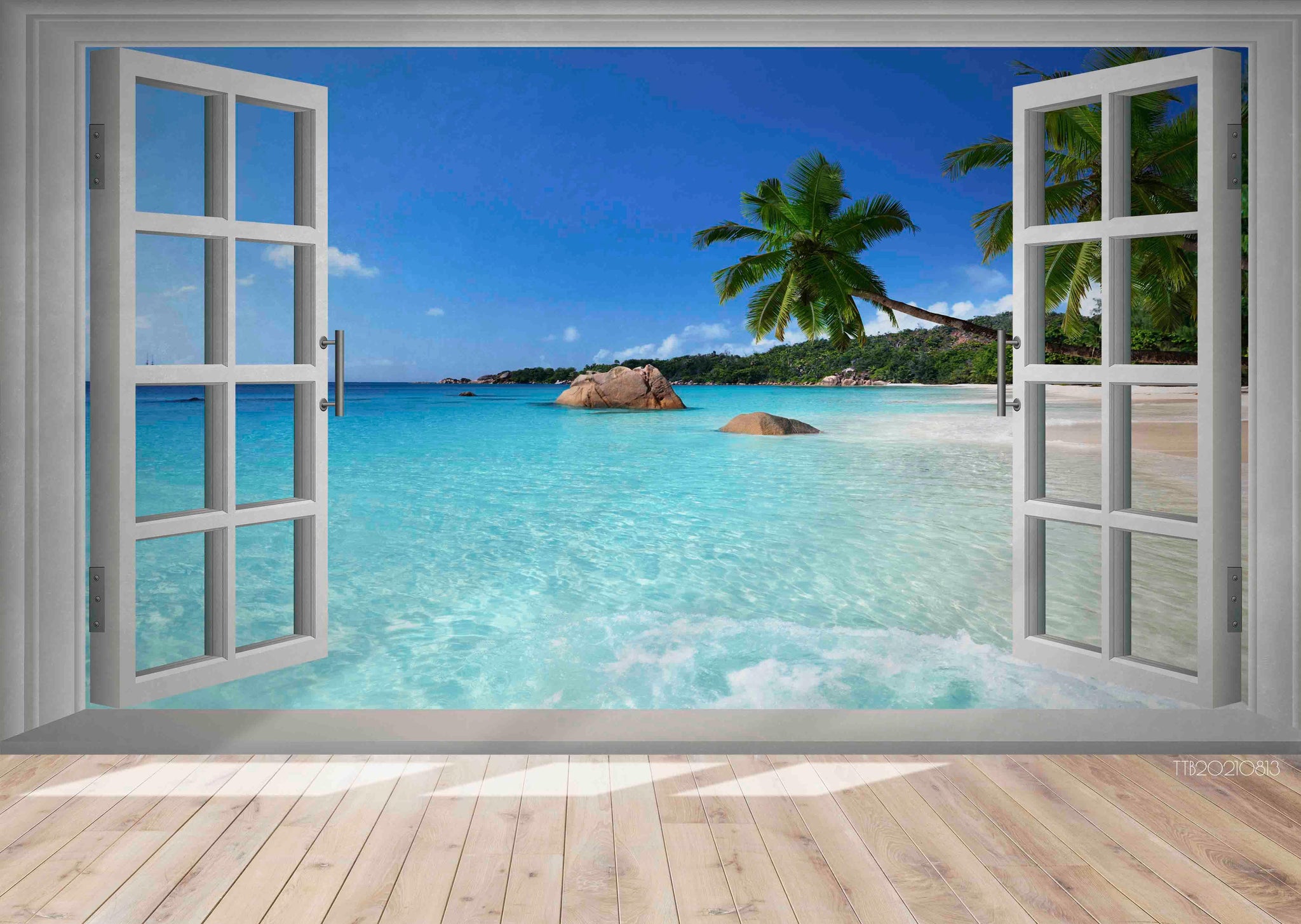 3D Window Sea View Beach Coconut Ttrees Wall Mural Wallpaper 5134