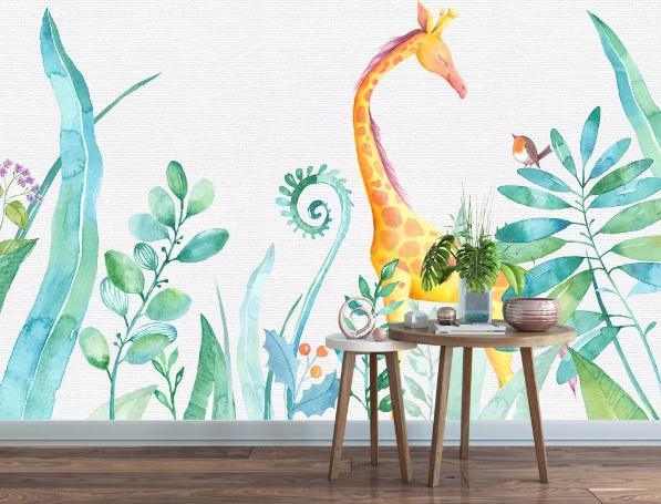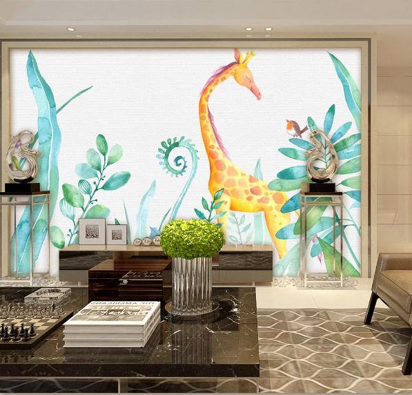 3D Hand Painted Green Leaf Giraffe Wall Mural Wallpaper 123