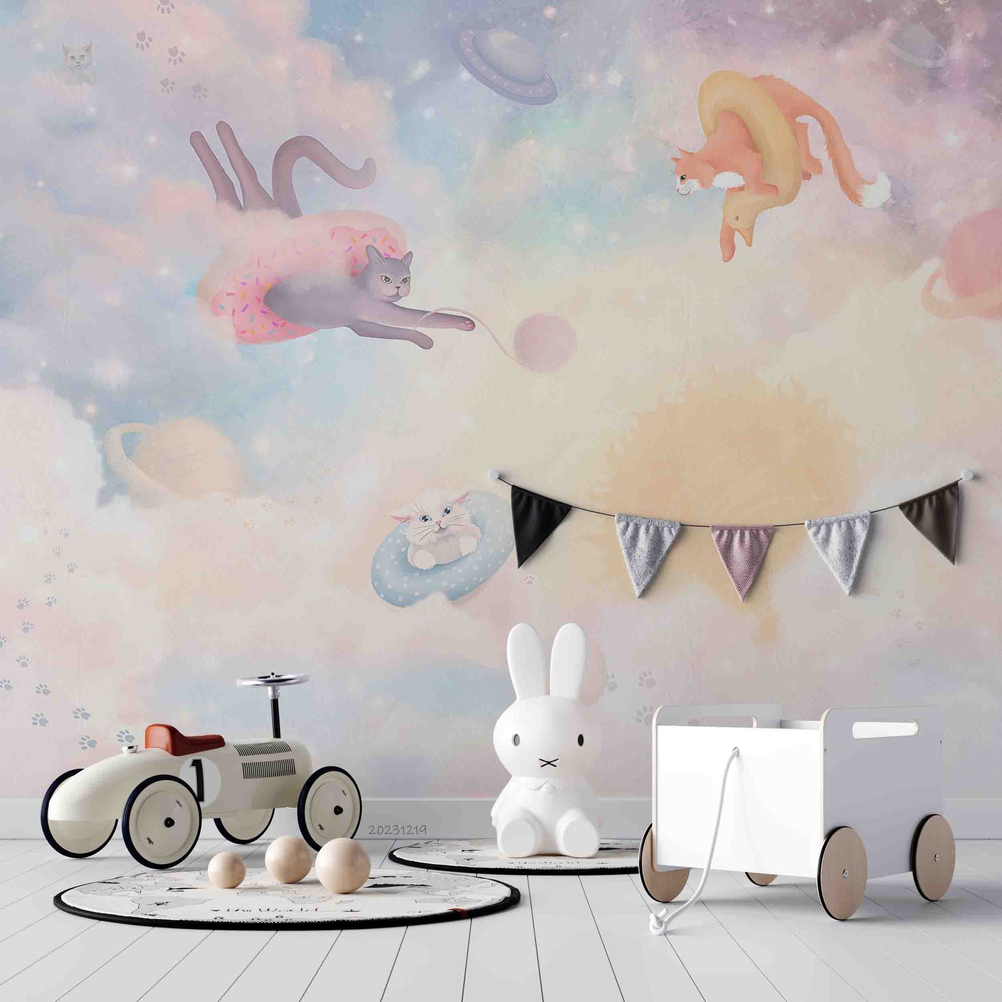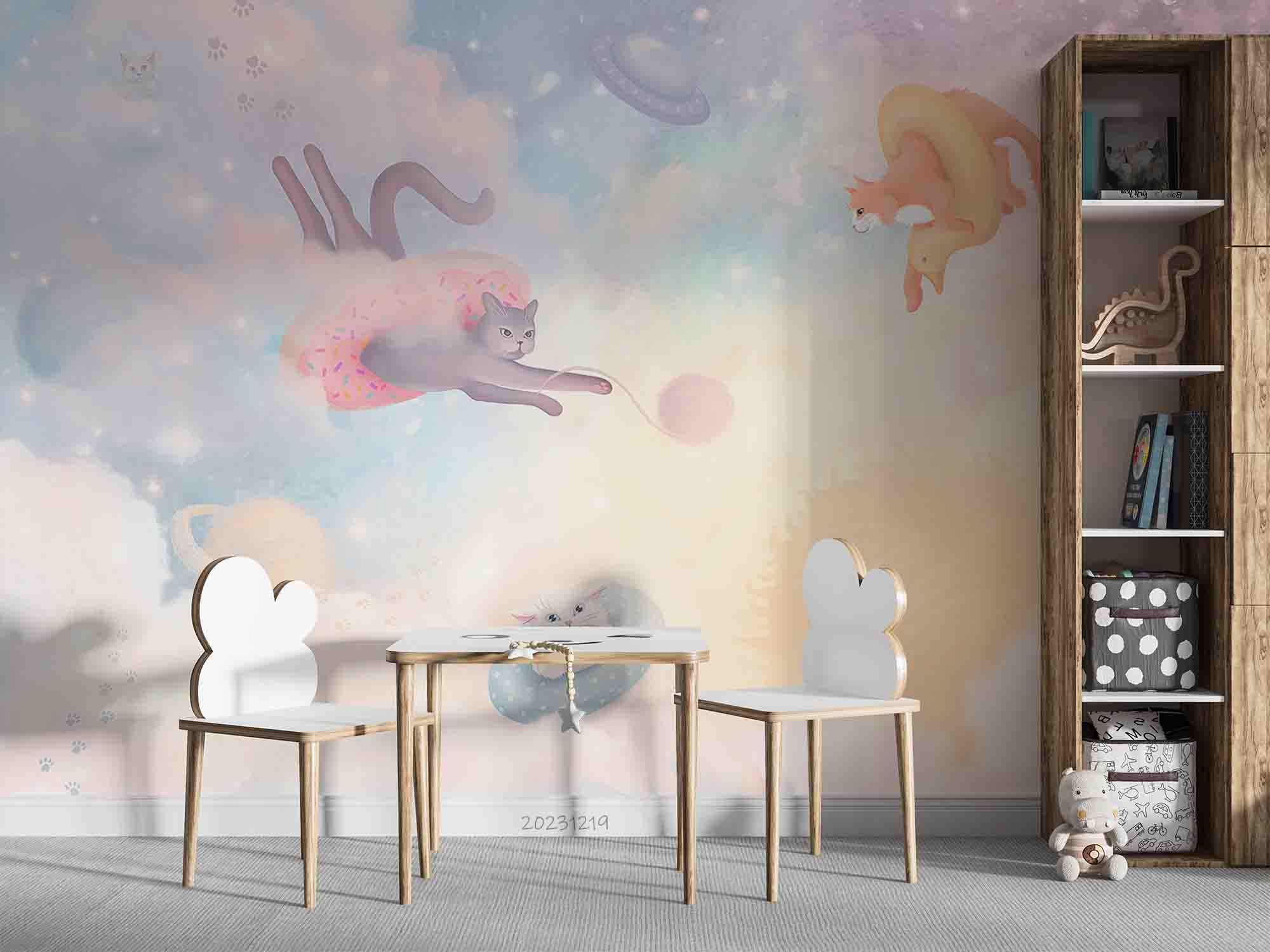 3D Animal Cat Swim Ring Cloud The Earth Space Station Wall Mural Wallpaper YXL 29