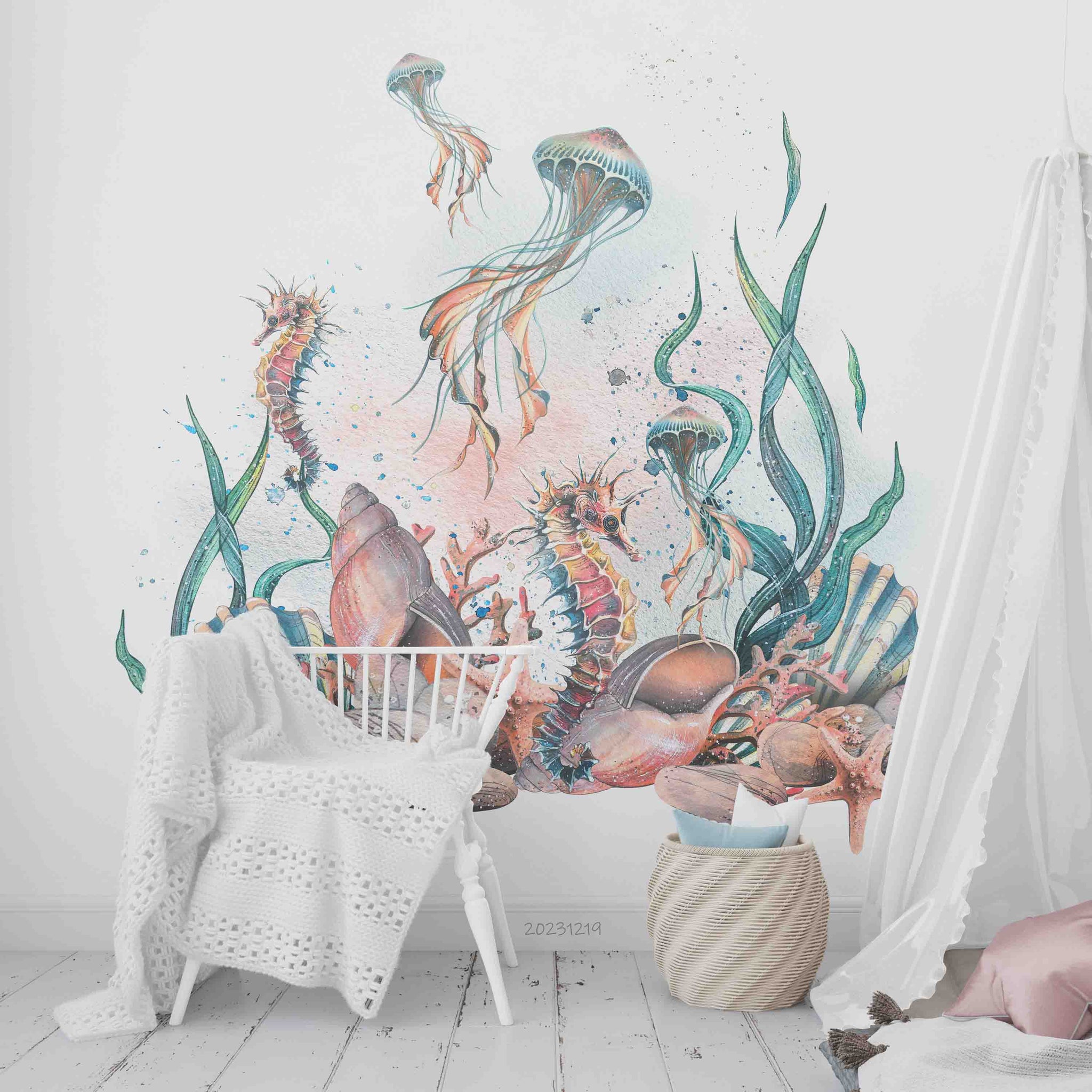 3D Animal Starfish Sea Horse Octopus Stone Wall Mural Wallpaper YXL 37