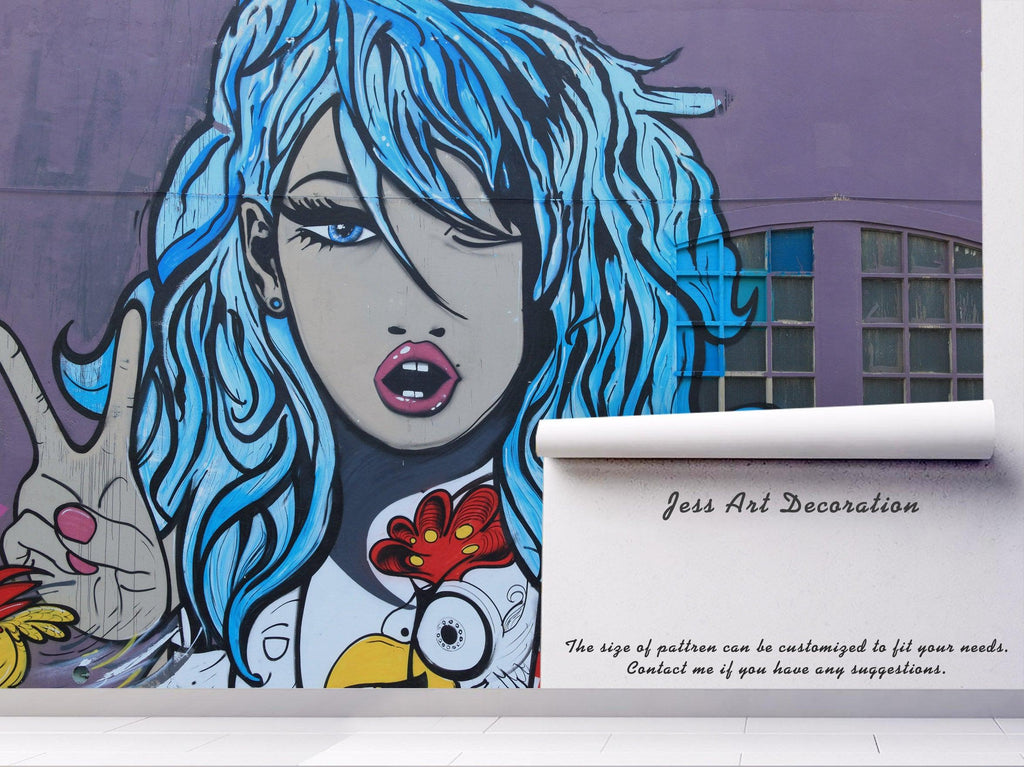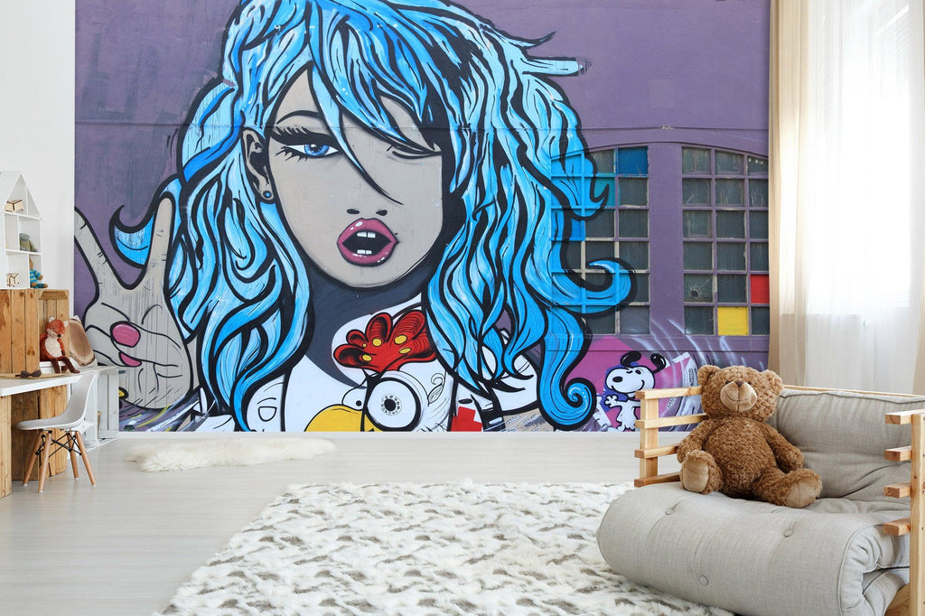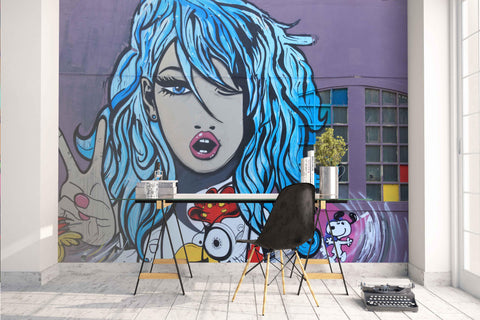3D Blue Girl Building Graffiti Wall Mural Wallpaper 76