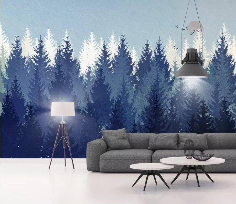 3D Blue, Modern, Simple, Pine forest, Bird Wallpaper