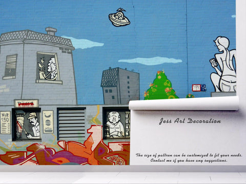 3D Cartoon City Building UFO Wall Mural Wallpaper 137