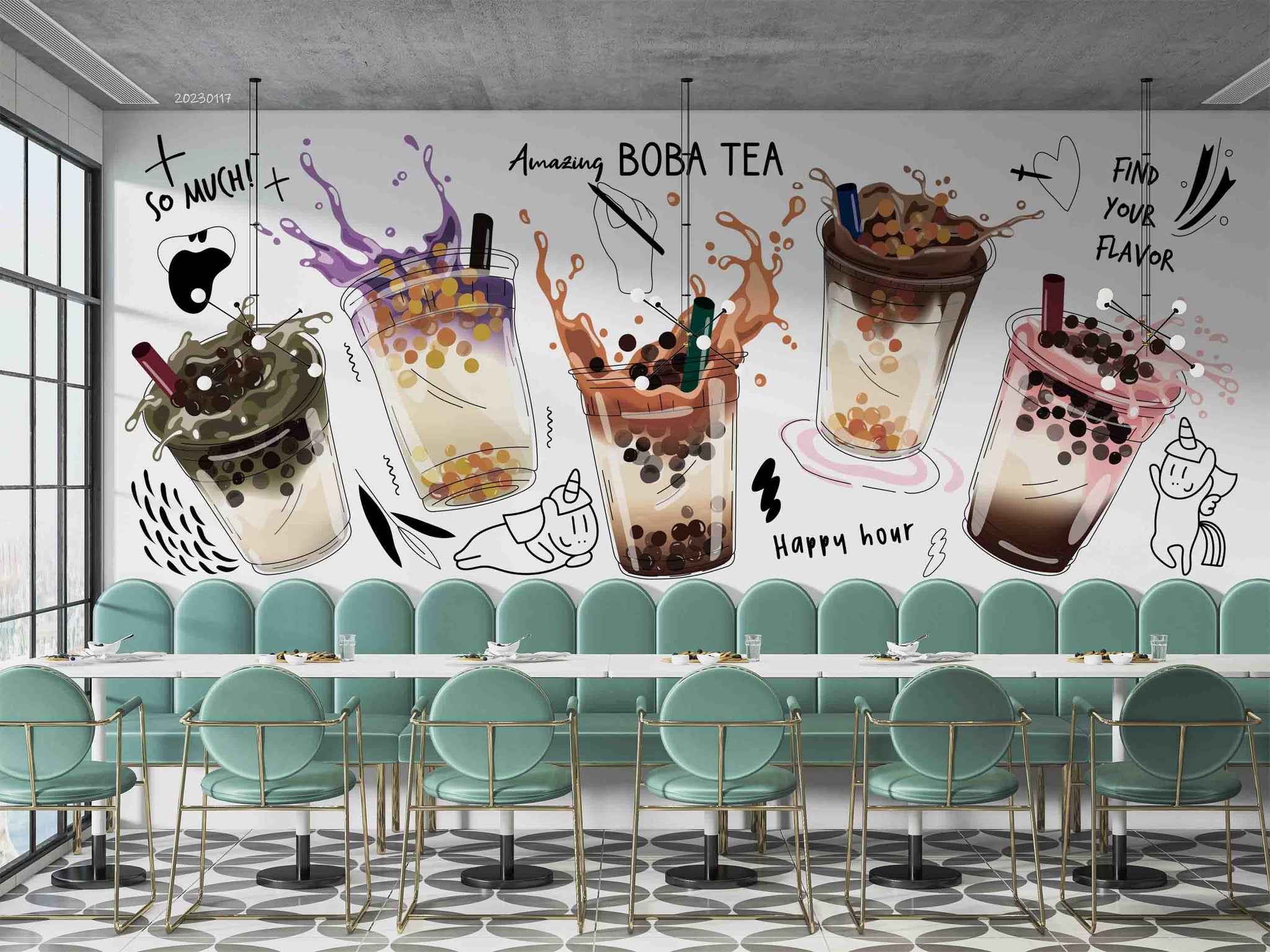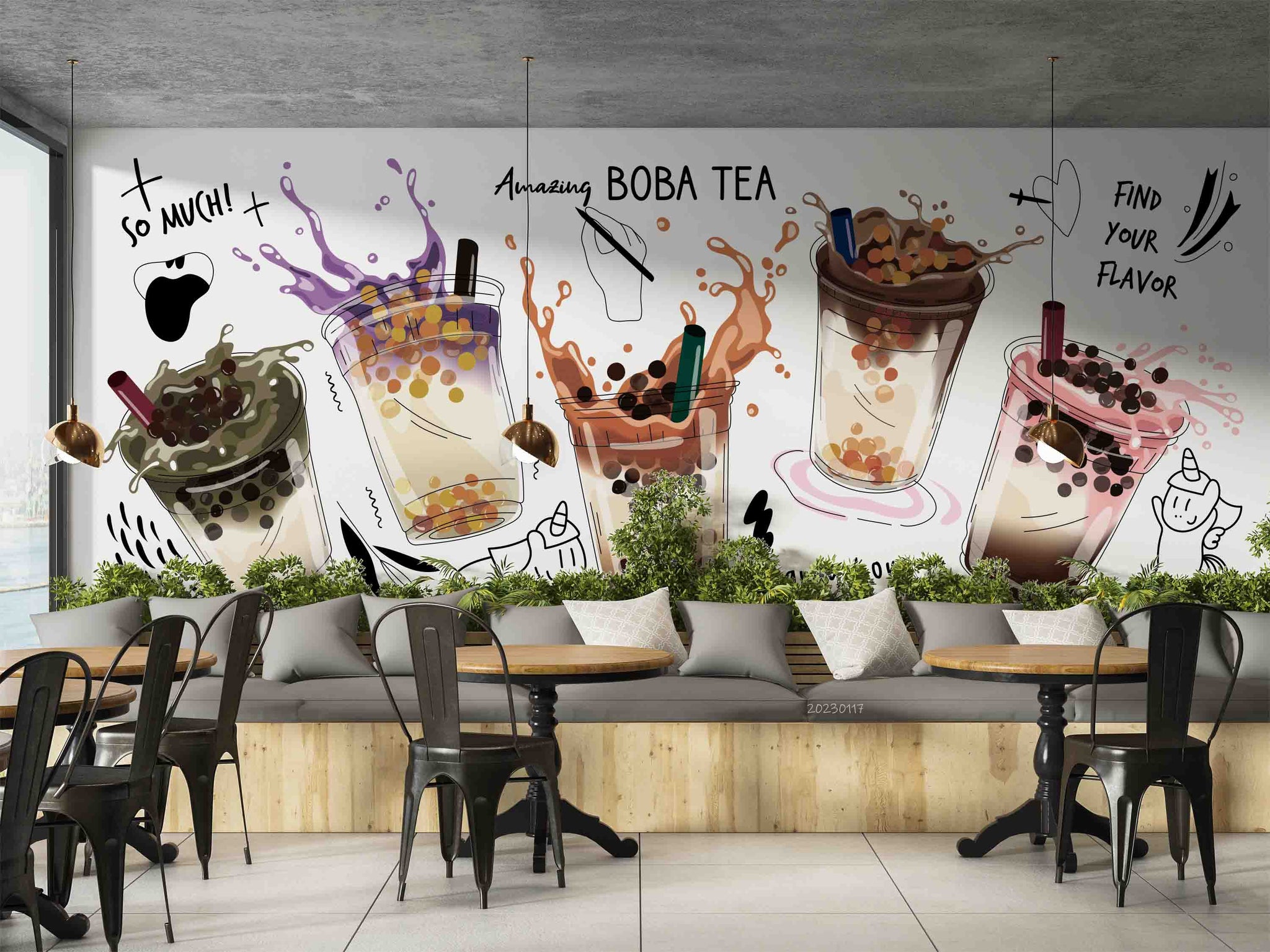 3D Hand Drawn Bubble Tea Pearl Tea Milk Tea Shop Wall Mural Wallpaper JN 30