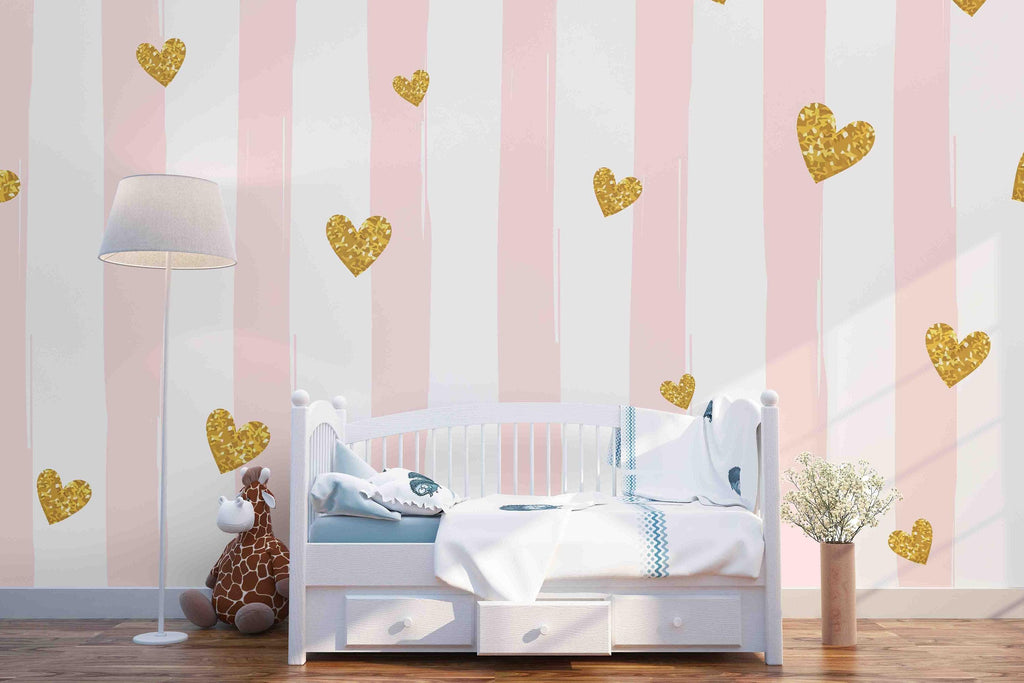3D Pink Strips Gold Heart Removable Wallpaper,Peel & stick Wall Mural, Wall Art,Wall Decal,Kids,Nursery,Wall Sticker,Jess Art 42